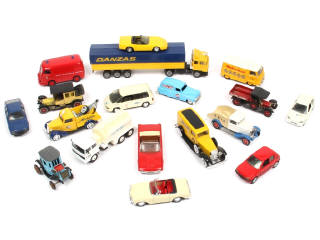 miniatures reproduisant notamment les modèles : RENAULT, PEUGEOT, CITROËN & DAF - on y retrouve notamment les marques : SOLIDO, MATCHBOX, LLEDO, CITY & JMK - quelques manques & parties cassées
