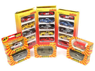 les boites sont en état 'b' avec quelques déformations & accrocs (sur certains exemplaires) - miniatures reproduisant notamment les modèles : PORSCHE (réunis en 3 coffrets), RENAULT & MERCEDES (un sigle de calandre légèrement déformé)