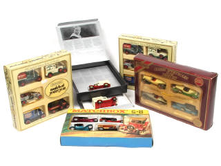 miniatures reproduisant notamment les modèles : MERCEDES, AUBURN, STUTZ BEARCART, FORD & ROLLS ROYCE - petits accrocs sur certaines boîtes (2 coffrets en série limitée)
