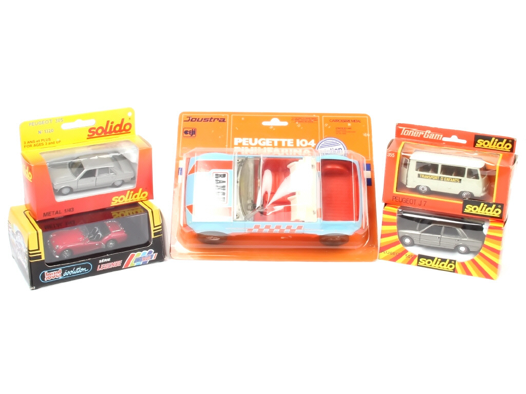 différentes échelles - comprends les modèles : PEUGEOT J7, 305, 505, PEUGETTE 104 & TRIUMPH TR3A - on y retrouve les marques : JOUSTRA, SOLIDO & JOUEF EVOLUTION