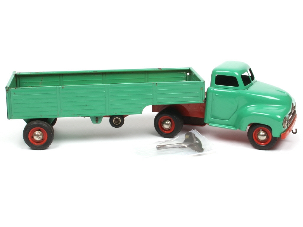 longueur 39 cm - avec moteur à clef (fonctionne), clef & direction - traces d'oxydation - la remorque est en état 'D'