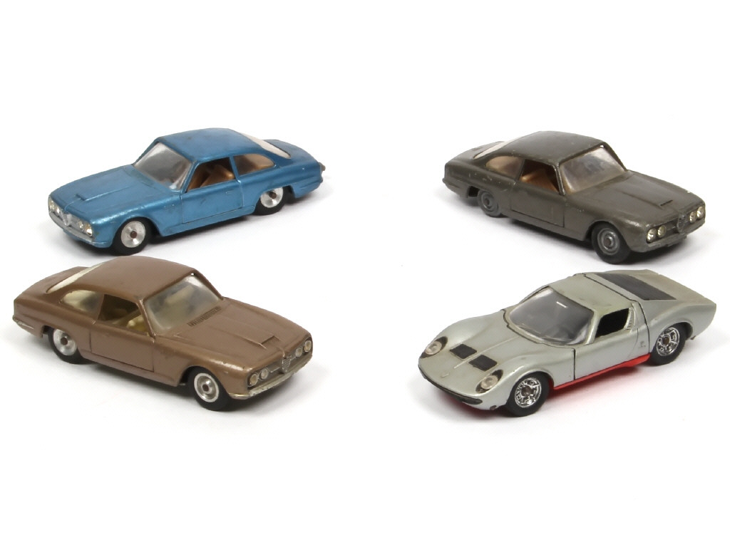 miniatures reproduisant les modèles : LAMBORGHINI (un manque de peinture sur une extrémité de plancher) & ALFA ROMEO (un exemplaire démontable & un autre avec manques)