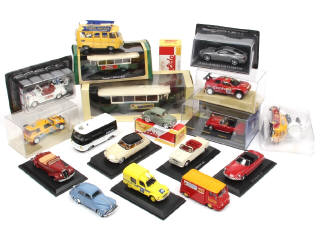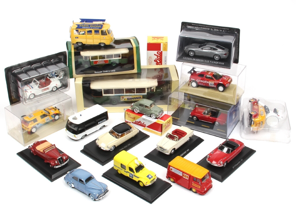 miniatures reproduisant notamment les modèles : CITROËN, PEUGEOT (un exemplaire avec suspension affaissée), RENAULT & ASTON MARTIN - on y retrouve notamment les marques : NOREV, SOLIDO & EDITIONS ATLAS - 8 exemplaires sans boîte (boîtes état 'b')
