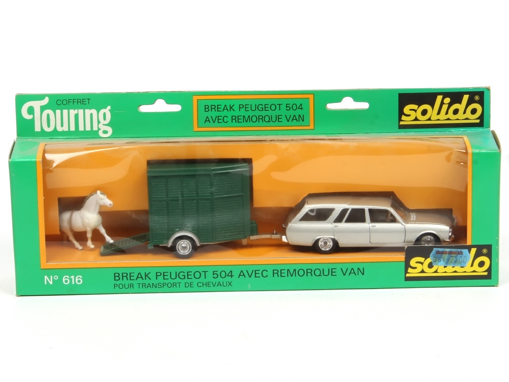 contient : PEUGEOT 504 Break, remorque van THEAULT & un cheval - blister de boite décollé par endroits (étiquette collée sur une face)