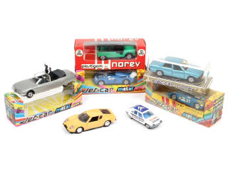 on y retrouve notamment les séries JET-CAR & MINI-JET comprend les modèles : CITROEN (dont une sans roue de secours), PEUGEOT, CHEVRON, LIGIER & ALPINE (en état 'C') - 2 exemplaires sans boite