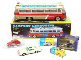 différentes échelles - 2 exemplaires avec moteur à friction fonctionnent - on y retrouve notamment les marques : CORGI TOYS, MF & YONEZAWA - les boîtes sont en état 'b' avec quelques accrocs par endroits (un exemplaire sans boîte)
