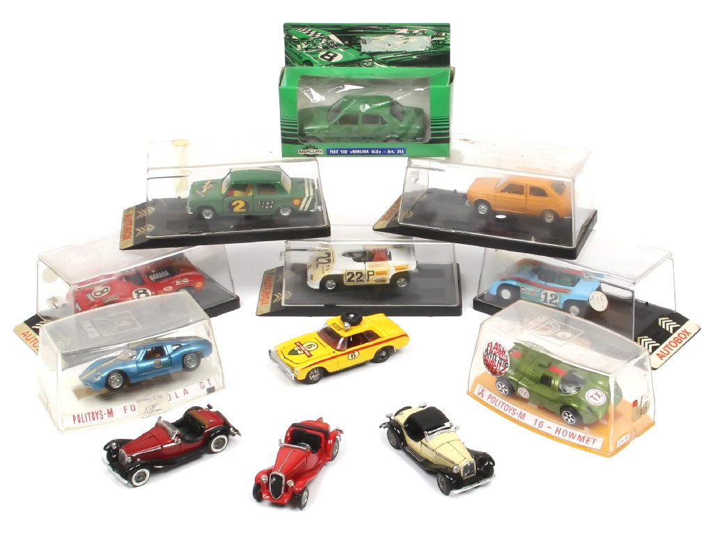 miniatures reproduisant notamment les modèles : ALFA ROMEO, FIAT, MERCEDES, PORSCHE & FORD - on y retrouve notamment les marques : POLITOYS, MERCURY & POLISTIL - quelques petits détails de peinture ajoutés avec quelques accessoires manquants sur certains exemplaires - boites (4 exemplaires sans) en états 'b' & 'd' dont certaines encrassées
