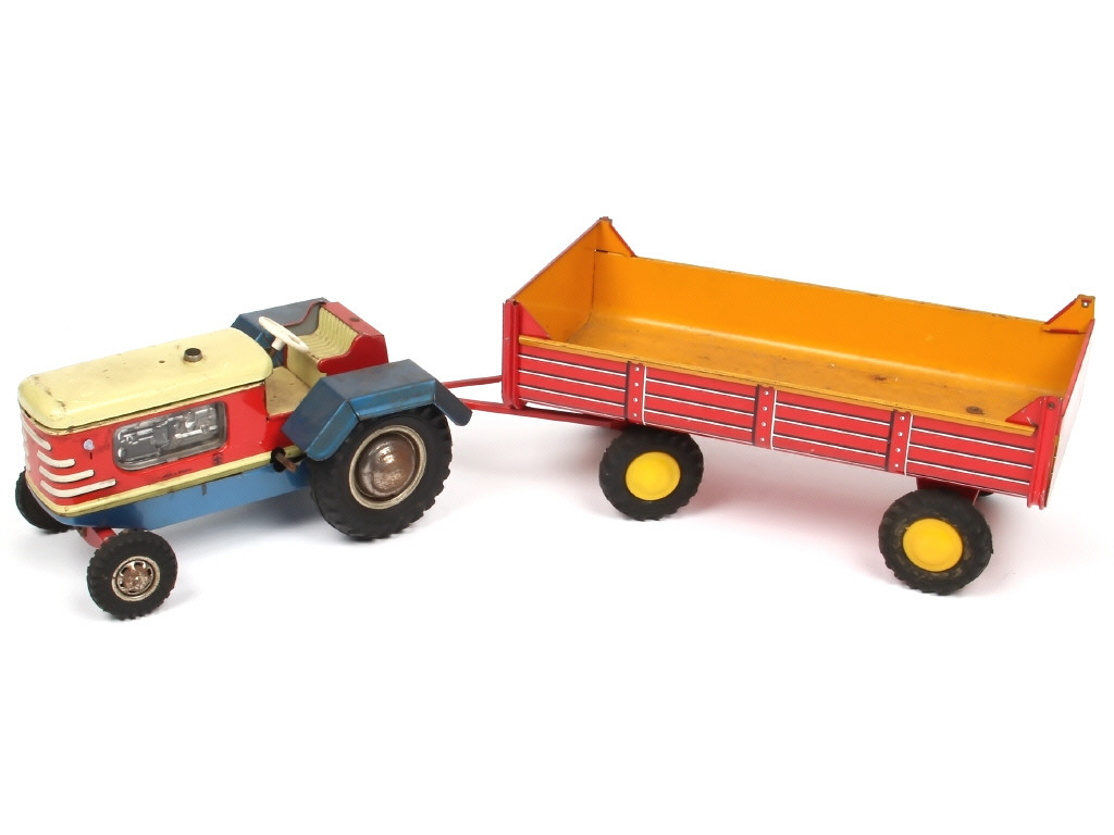 longueur 21 cm - moteur à clef (fonctionne) - on y joint une remorque de la marque (référence 451) - avec manques, parties cassées & traces d'oxydation