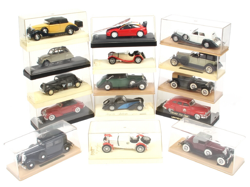 miniatures reproduisant notamment les modèles : BUGATTI, CITROËN, ALFA ROMEO & JAGUAR - une boîte plus ou moins déformée & une autre jaunie - possibilité de petits accessoires manquants