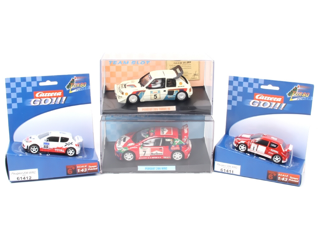 différentes échelles - comprend les modèles : 205 TURBO 16, 206 WRC (3 exemplaires différents) - on y retrouve les marques : CARRERA & TEAM SLOT