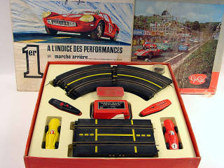 dimensions du coffret : 47,5 x 47,5 cm - contient : 2 voitures de course, 4 rails droits, 8 rails courbes, 2 poignées, un transformateur & un moteur de rechange - avec cale de boîte