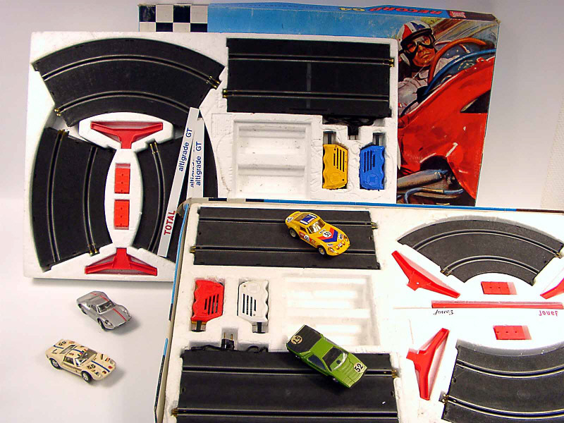dimensions du coffret : 60 x 40 cm - contient : une PORSCHE GT, une FORD GT, 10 rails droits, 2 demi-rails droits, 7 rails courbes, 4 rails courbes de virages relevés, 2 poignées & des accessoires de piste - décalques ajoutés sur la FORD GT