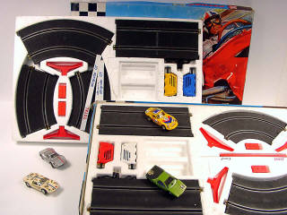dimensions du coffret : 60 x 40 cm - contient : une FERRARI 250 GTO, une CARABO BERTONE, 10 rails droits, 4 rails courbes, 4 rails courbes de virages relevés, 2 poignées & des accessoires de piste - décalques ajoutés sur la FERRARI