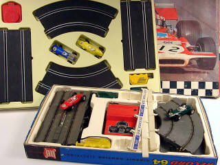 dimensions du coffret : 61 x 41 cm - contient : une B.R.M., une MATRA F1, 6 rails courbes, 4 rails droits, 2 poignées & un boîtier à piles