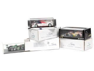 4 exemplaires Le Mans - miniatures reproduisant les modèles : PEUGEOT, REYNARD, CHRYSLER, MG-LOLA & MORGAN-NISSAN - légères traces d'humidité sur quelques suremballages
