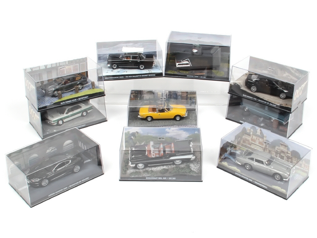 collection 'JAMES BOND' - miniatures reproduisant notamment les modèles : BMW, ASTON MARTIN, CHEVROLET, FORD & TRIUMPH - une boîte fêlée (état 'b')