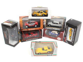 miniatures reproduisant notamment les modèles : LAMBORGHINI, FERRARI, NISSAN, CITROEN, CHRYSLER & RENAULT - on y retrouve notamment les marques : KYOSHO, NOREV, HERPA, ONYX & MODEL BOX - un modèle Le Mans & un autre 'Paris Dakar' - quelques petits accrocs sur certains suremballages