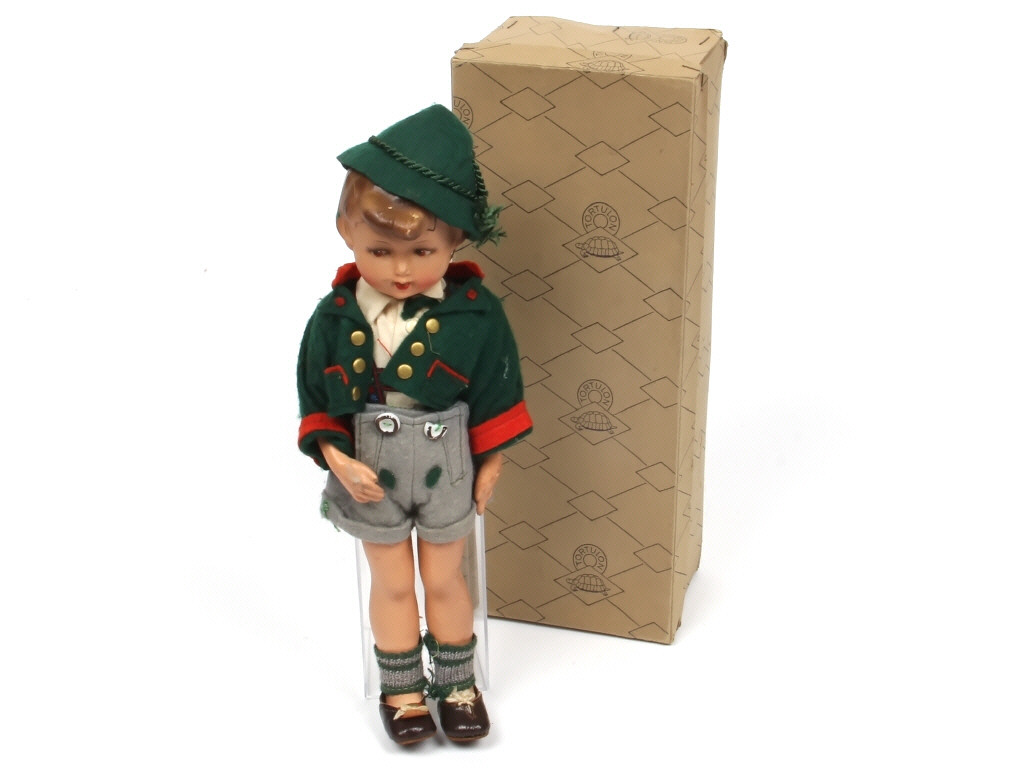hauteur 27 cm - quelques craquelures de peinture plus ou moins importantes par endroits - un petit enfoncement sur la tête - un bouton incomplet & un élément de chaussure manquant - habits légèrement défraîchis