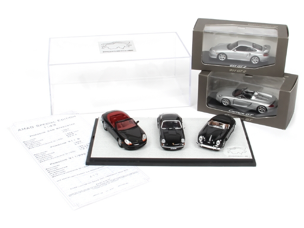comprend les modèles : CARRERA GT, 911 GT2, S, 356 SPEEDSTER 1 911/996 cabriolet - on y retrouve les marques : MINICHAMPS & UNIVERSAL HOBBIES (3 exemplaires regroupés en coffret '50ème anniversaire de la marque PORSCHE')- avec certificat d'édition limitée numéroté 419/500 exemplaires)