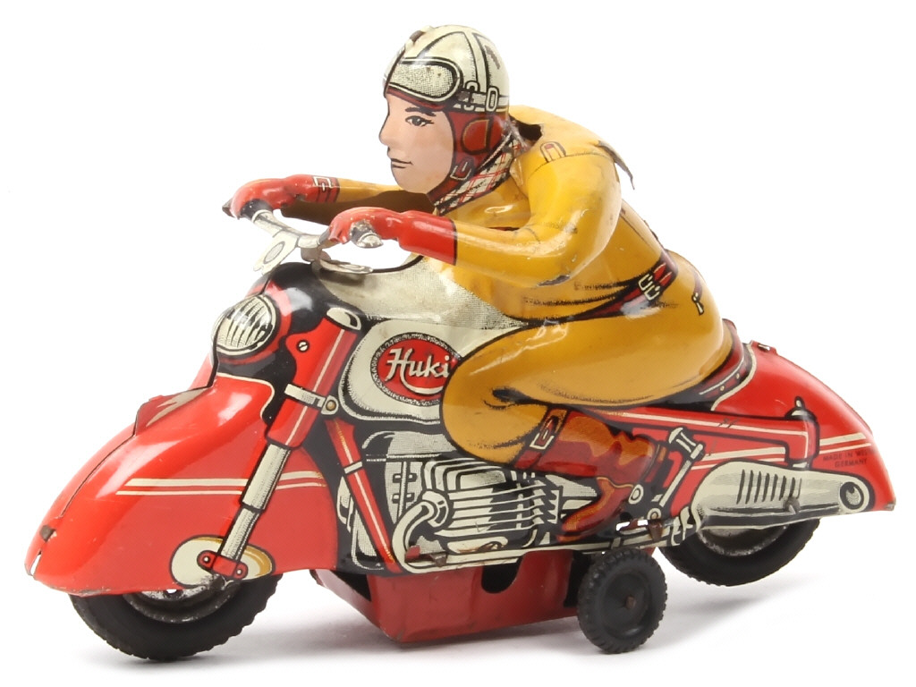 HUKI (ALLEMAGNE) Moto de course en tôle lithographiée rouge, ocre & blanc