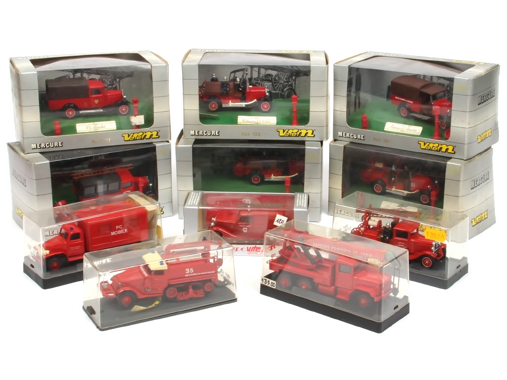 miniatures reproduisant notamment les modèles : GMC, CITROËN, RENAULT & MERCEDES - on y retrouve principalement la marque VEREM - manque quelques petits accessoires - les boîtes sont en état 'b' avec traces d'humidité & blisters décollés sur certaines (4 exemplaires sans suremballage)