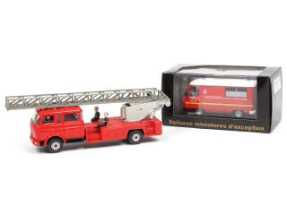 comprend : PEUGEOT J9 VSUAB (en boîte état 'a') & BERLIET GBK18 grande échelle de pompiers (très léger manque sur un accessoire d'échelle, un pompier recollé)