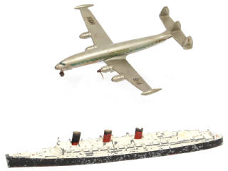 comprend : LOOKEED SUPER G CONSTELLATION (DINKY TOYS FRANCE) & paquebot QUEEN MARY de la marque TRIANG MINIC - avec manques & parties cassées