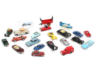 on y retrouve les marques : DINKY MATCHBOX, MATCHBOX, MAJORETTE, SOLIDO, DEL PRADO, NOREV & CORGI TOYS - avec manques & parties cassées - une importante trace d'humidité sur la remorque