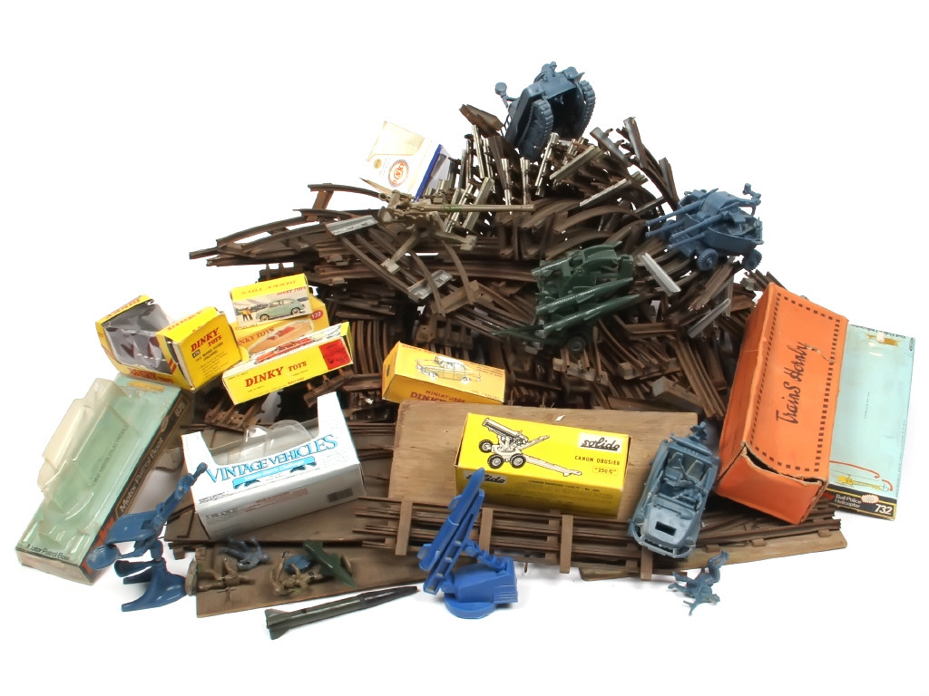 importantes traces d'oxydation - on y joint 4 véhicules militaires, 3 canons (réalisation en plastique) & 11 boîtes vides (états de 'c' à 'e', marques MECCANO & ERTL, 4 copies) - avec manques & parties cassées