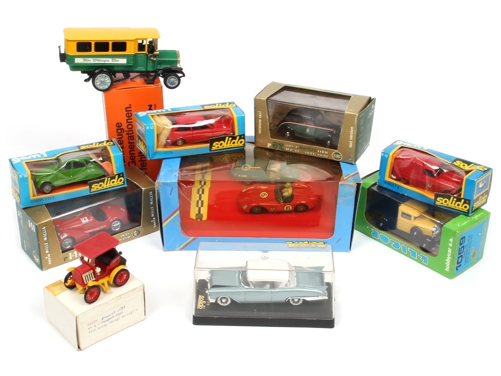 miniatures reproduisant notamment les modèles : RENAULT, CITROËN, FIAT, ALFA ROMEO & CADILLAC - on y retrouve les marques : VEREM, SOLIDO, ELIGOR, BRUMM, ZISS MODELL & SAFIR - les boîtes sont en états de 'b' à 'c'