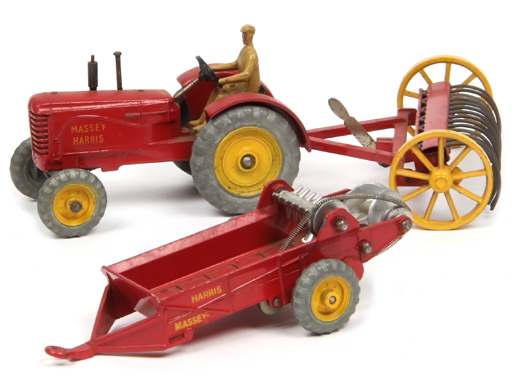 version avec roues métal - on y joint un râteau à foin & une remorque épandeur d'engrais - carrosseries plus ou moins décolorées & encrassées (quelques éclats plus ou moins importants par endroits)