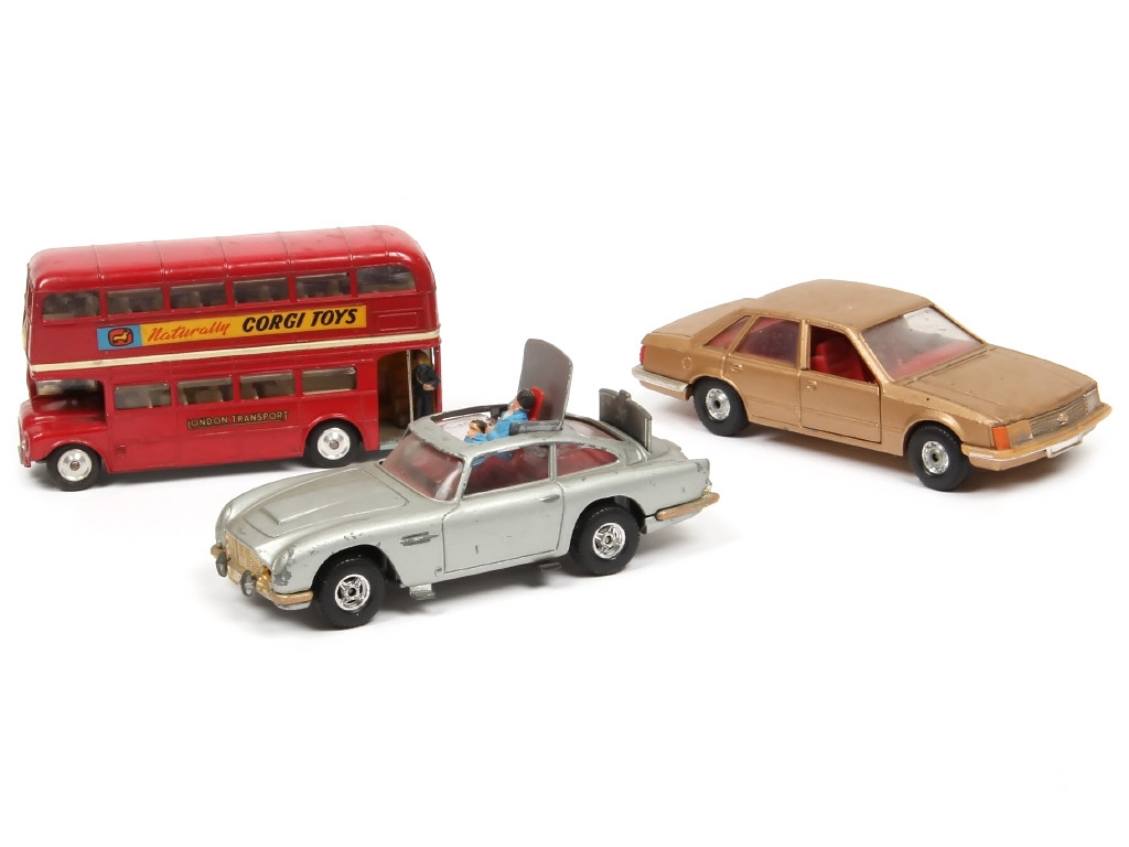 comprend : ROUTEMASTER autobus londonien (pneus séchés dont un manquant), OPEL SENATOR & ASTON MARTIN DB5 'JAMES BOND' (fonctionne - avec passager - plaque d'immatriculation avant incomplète) - carrosseries plus ou moins encrassées, ternies & tachées