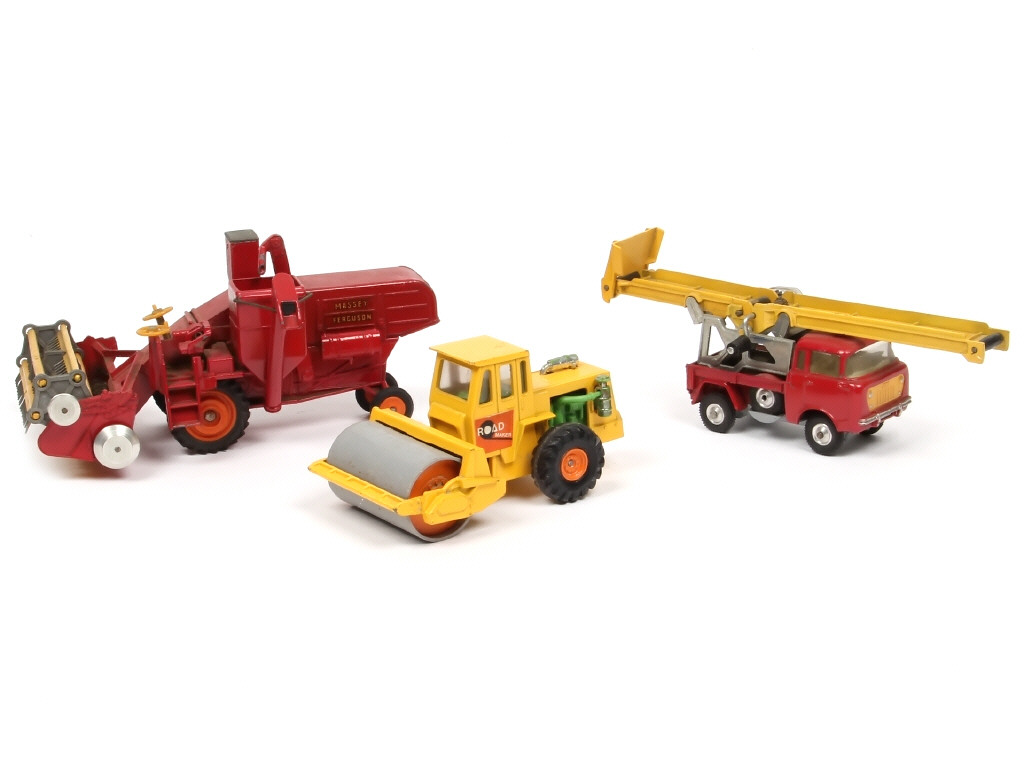 comprend : JEEP 150 avec monte-charge, MASSEY-FERGUSSON moissonneuse bâteuse & RASCAL rouleau compresseur - carrosseries plus ou moins encrassées & ternies - quelques manques & parties cassées