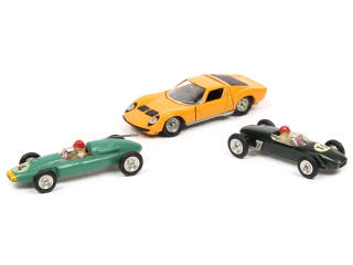 comprend : LOTUS & COOPER 1500 (sortie d'échappement légèrement ternie) - on y joint une LAMBORGHINI P400 MIURA de la marque VEREM (2 lamelles de cache-moteur cassées - direction légèrement déficiente) - 2 carrosseries plus ou moins encrassées