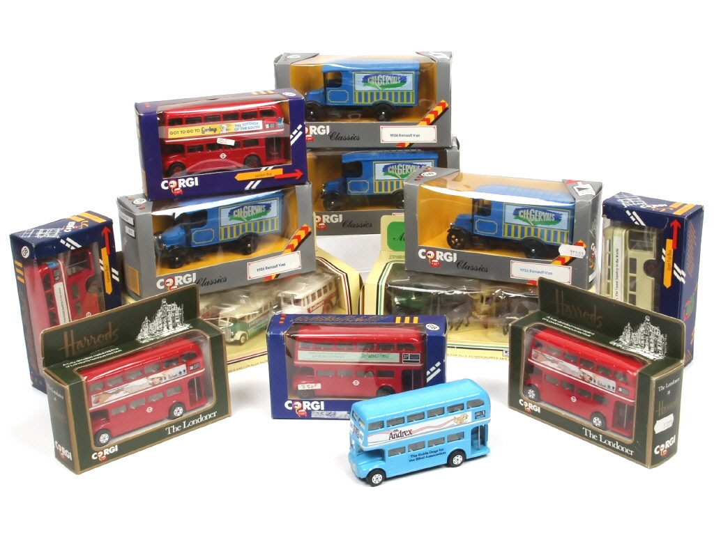 miniatures reproduisant notamment le modèle RENAULT (un exemplaire en état 'B' avec importantes traces d'humidité sur le capot-moteur) - on y retrouve les marques : CORGI TOYS & LLEDO - quelques boites en état 'b'