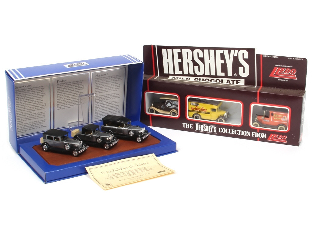comprend : coffret ROLLS ROYCE (3 exemplaires différents sur socle de présentation en bois - série limitée numéroté 2470/7500 exemplaires) & coffret 'HERSHEY'S'