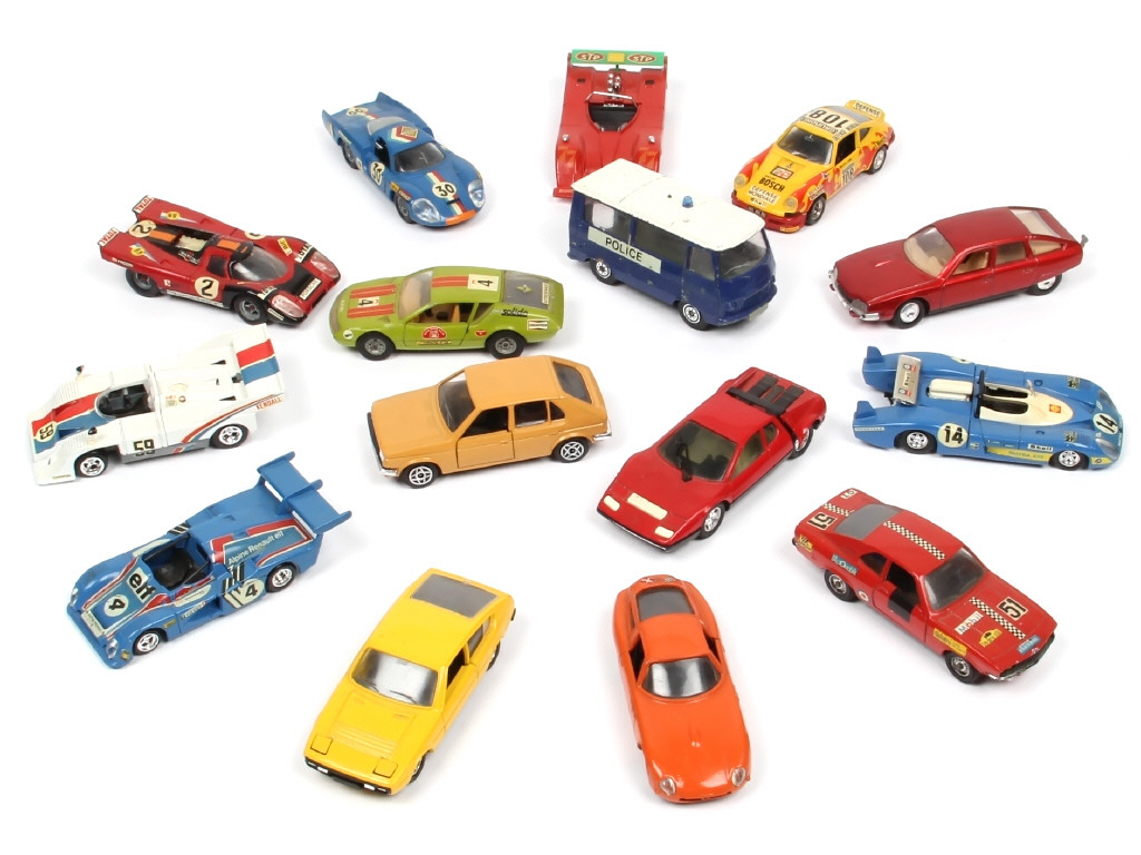 miniatures reproduisant notamment les modèles : CITROËN, ALPINE, PEUGEOT, ALFA ROMEO, OPEL, TALBOT & FERRARI - quelques manques & parties cassées - carrosseries plus ou moins encrassées