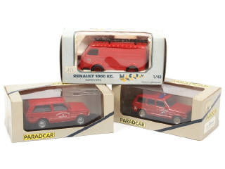 comprend : JEEP CHEROKEE, RANGE ROVER (quelques fêlures sur le couvercle de boite) & RENAULT 1000 KG - on y retrouve les marques : PARADCAR & MACADAM - boites légèrement encrassées, décolorées avec quelques accrocs
