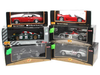 échelle 1/18ème - miniatures reproduisant les modèles : CHEVROLET, AUDI, MERCEDES, FERRARI & PORSCHE - boîtes plus ou moins salies