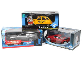 échelle 1/18ème - comprend les modèles : CITROËN 2CV 'JAMES BOND' & PEUGEOT RC CARREAU - on y joint une ASTON MARTIN V12 VANQUISH de la marque PAUL'S MODEL ART - quelques petits accrocs sur les boîtes
