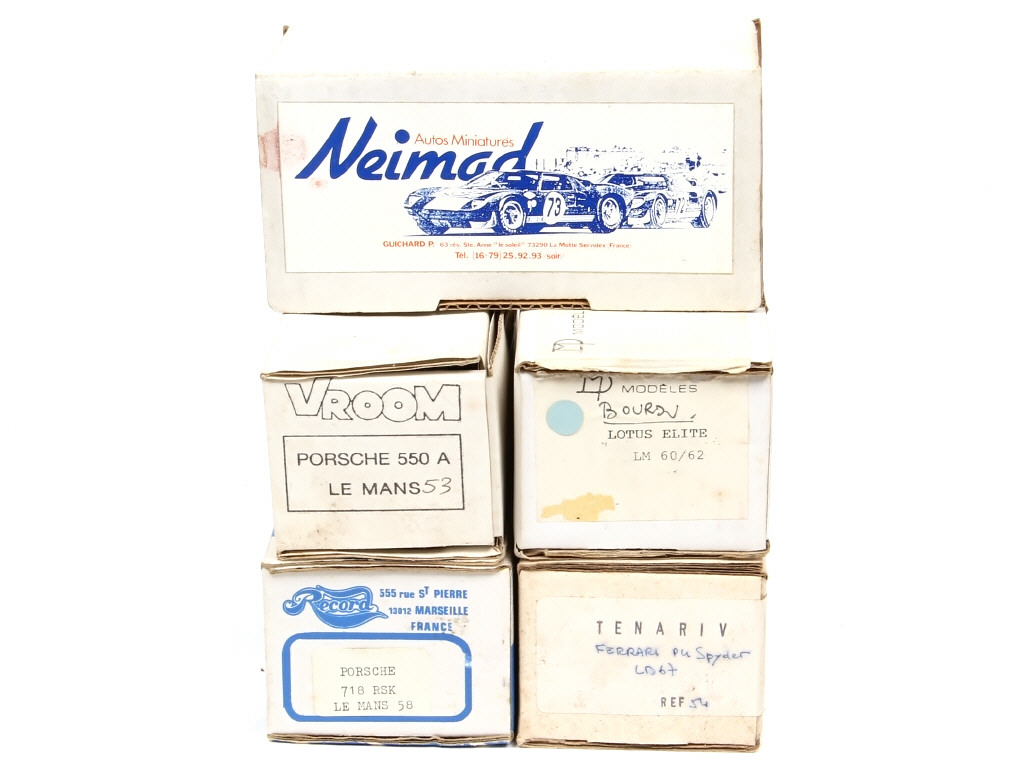 kits à monter (semblent complets) - miniatures reproduisant les modèles : FORD, LOTUS, PORSCHE & FERRARI (un exemplaire monté - manque une fixation de plancher - boite non conforme) - on y retrouve les marques : RECORD, NEIMAD (sans notice), VROOM, TENARIV & DM MODELES - quelques annotations & traces d'humidité sur les boites (plus ou moins importants)