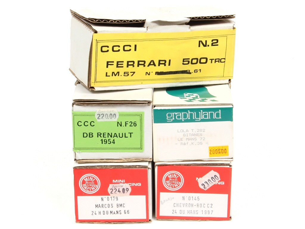 kits à monter (semblent complets) - miniatures reproduisant les modèles : FERRARI 500 TRC (1957), DB RENAULT (1954), CHEVRON-ROC (1987), MARCOS BMC (1966) & LOLA T282 (1972) - on y retrouve les marques : MINI RACING, GRAPHYLAND, CCCC & CCCI