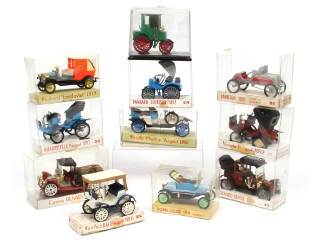 miniatures reproduisant notamment les modèles : PEUGEOT, PACKARD, PANHARD-LEVASSOR & FORD - avec petits manques & parties cassées - une carrosserie décolorée - les boites sont en états de b' à 'c'