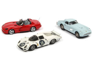 comprend : CHRYSLER VIPER, FERRARI 375 AMERICA 1954 & 365 P2 Le Mans (une petite fêlure sur une aile) - 2 carrosseries plus ou moins encrassées - on y retrouve les marques : MINICAR, ESDO & OLD CARS