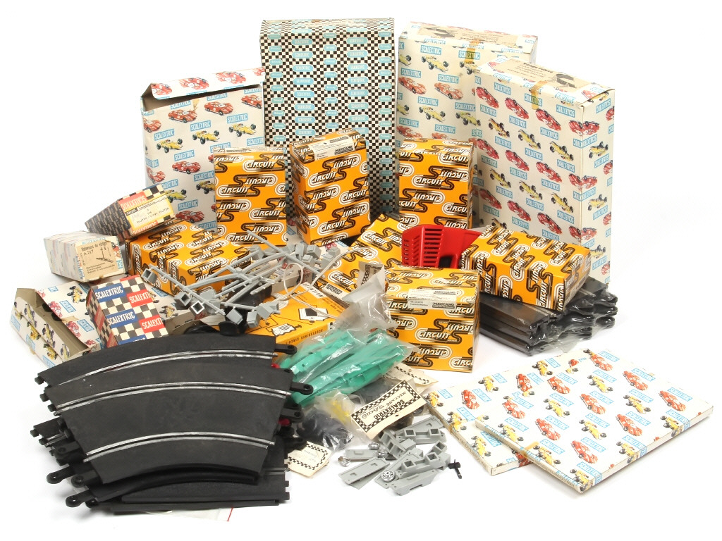 comprend notamment : transformateurs, poignées d'impulsion, différents rails & releveurs pour virages - on y retrouve les marques : SCALECTRIX (principalement), MECCANO & JOUEF - les boites sont en état de 'b' à 'c' - possibilités de petites déchirures