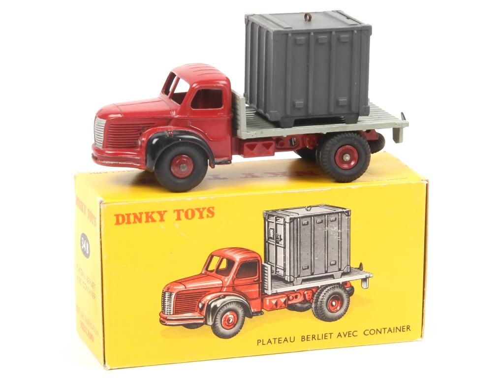 DINKY TOYS (FRANCE) 34B BERLIET Plateau avec container (version avec goupille) rouge, plateau gris clair