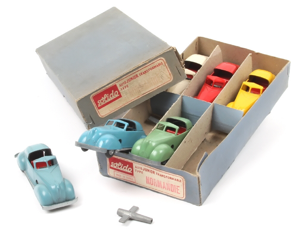 série JUNIOR transformable - contient 6 cabriolets décapotables (un exemplaire restauré en état 'D' avec parties repeintes, traces de métal fatigue & petits manques de matière par endroits) - moteurs à clef (fonctionnent) - avec 5 clefs dont une avec petites traces de métal fatigue - pneus plus ou moins séchés & affaissés - la boîte en état 'c', décolorée & tachée
