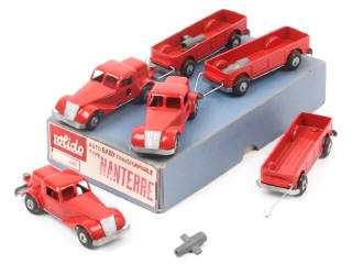 série BABY transformable - contient : 3 tracteurs routiers (non motorisés, traces d'oxydation sur les planchers, un exemplaire avec un petit éclat sur la base de la capote), 3 remorques (dont 2 en état 'C' avec traces de métal fatigue plus ou moins importantes, éclats présents) & 3 clefs - boîte légèrement tachée & décolorée (avec 2 séparations)