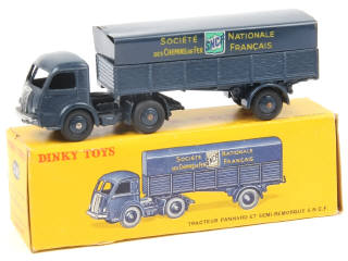 DINKY TOYS (FRANCE) 32AB PANHARD Semi-remorque 'S.N.C.F' (version avec intérieur de toit quadrillé) bleu foncé (fond de l'écusson uni)