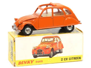 DINKY TOYS (FRANCE) 500 CITROËN 2CV Décapotée (made in SPAIN) orange avec plancher riveté & plaque minéralogique arrière jaune